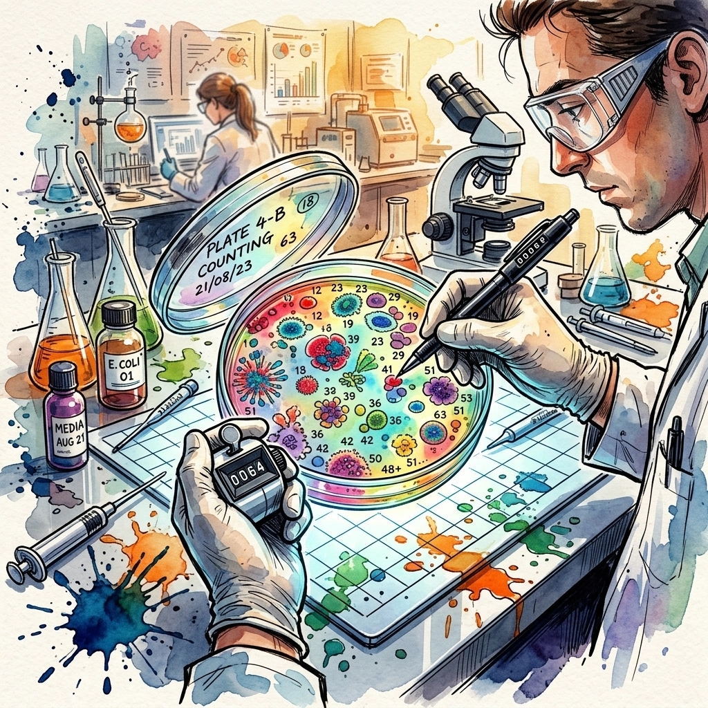 Each visible colony on a plate is assumed to originate from a single viable cell. That's why they are called CFU (Colony Forming Units).Concentration Formula:CFU/mL = (Colonies Counted × Dilution Factor) / Volume Plated# Best Practices for Counting
